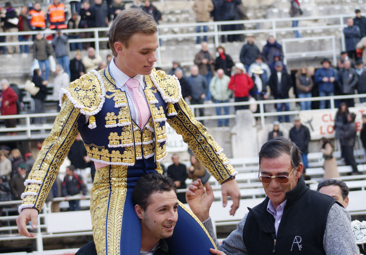 Le novillero français Marco Leal est sorti en triomphe des arènes d’Arles (Bouches-du-Rhône), après avoir obtenu un total de trois oreilles face au bétail de l’éleveur espagnol Antonio Palla, à l’issue de la corrida qui s’est déroulée dans la capitale provençale, ce Dimanche de Pâques, en fin de matinée. Avant cela, le novillero arlésien – qui réapparaissait en piste depuis sa blessure de Soustons, contractée le 5 août 2007 – a partagé un tour de piste final en compagnie du représentant de l’élevage implanté sur la province de Salamanque, le mayoral Emilio Enrique Morán. Une autre oreille a été accordée lors de cette course à l’apprenti-torero arlésien Román Pérez. L’amphithéâtre romain a enregistré un quart d’entrée lors de cette seconde novillada de la Feria de Pâques qui s’est déroulée sous un ciel panaché, avec une température fraîche.