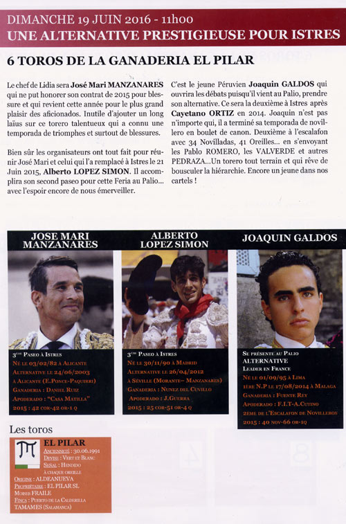 La présentation des Cartels a eu lieu ce Vendredi 29 Janvier 2016 en présence de François Bernardini, Maire de Istres. Au programme de la Féria de 2016 : 4 corridas (dont une corrida de gala avec Enrique Ponce seul contre 6 toros) et 1 novillada piquée.